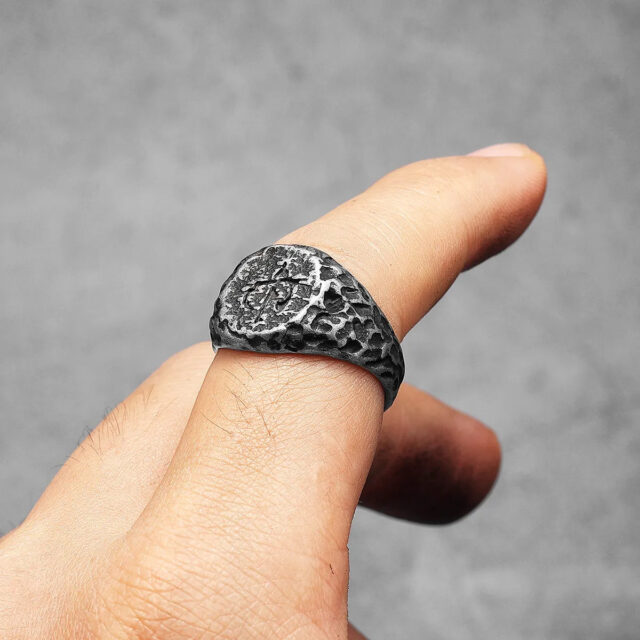 Make a bold statement with the Vintage Black Damaged Crater Stainless Steel Punk Men Ring. Its unique design and punk-inspired style will add an edgy touch to any outfit.