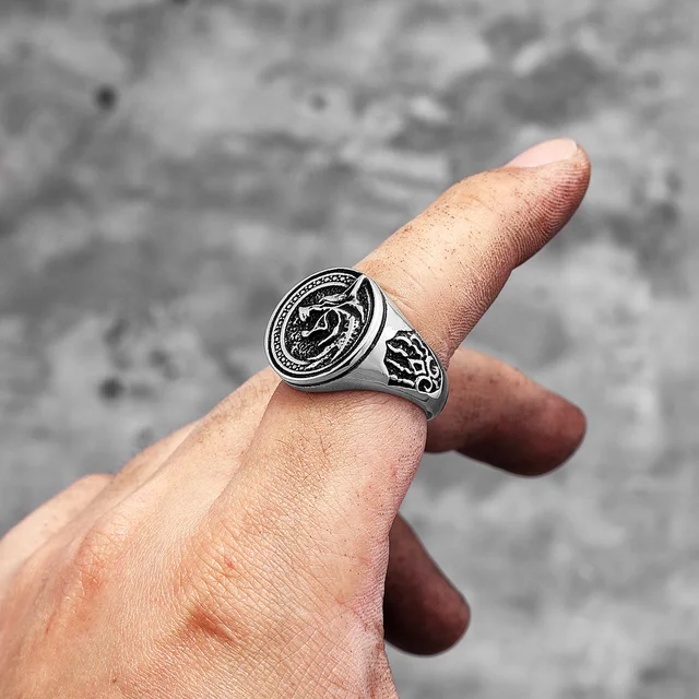 Embrace your inner monster slayer with the Witcher Wolf Head Ring. This bold stainless steel signet ring features the iconic wolf medallion, a symbol of strength and resilience, perfect for fans of the series or anyone who appreciates unique, eye-catching jewelry.