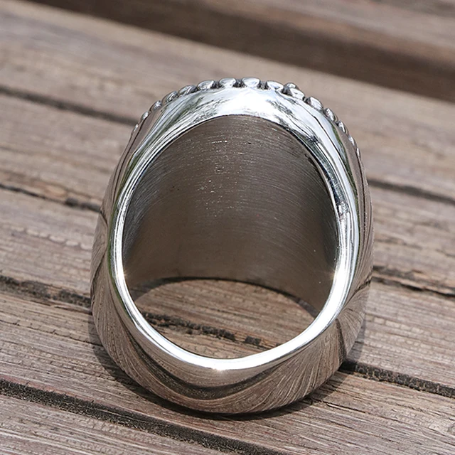 • The ring’s face has a classic oval shape with a rugged textured background.