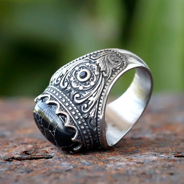 • Intricate vintage carvings on the band for a detailed, gothic aesthetic.