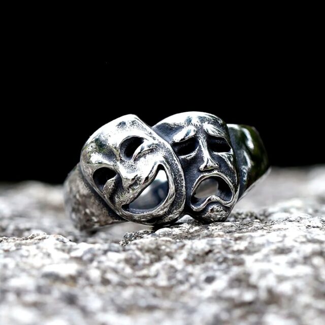 Embrace the duality of life with the Drama Masks Ring. This bold stainless steel ring features iconic comedy and tragedy masks, perfect for expressing your multifaceted personality and adding a touch of theatrical flair to any outfit. It’s more than just jewelry; it’s a statement.
