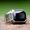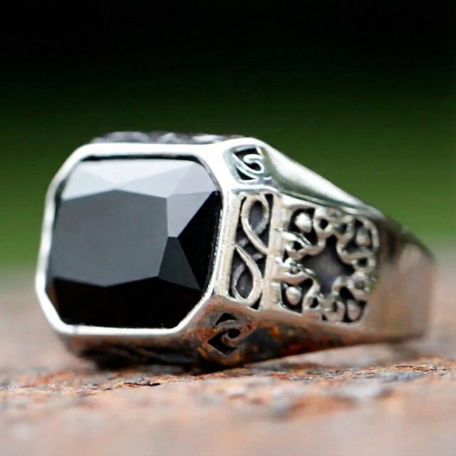 • The bold, faceted black stone is securely set, reflecting light with captivating intensity.