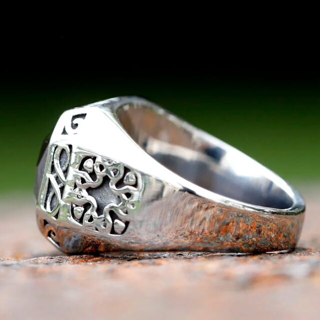 • Intricate filigree detailing flanks the stone, adding an ornate, artistic touch.