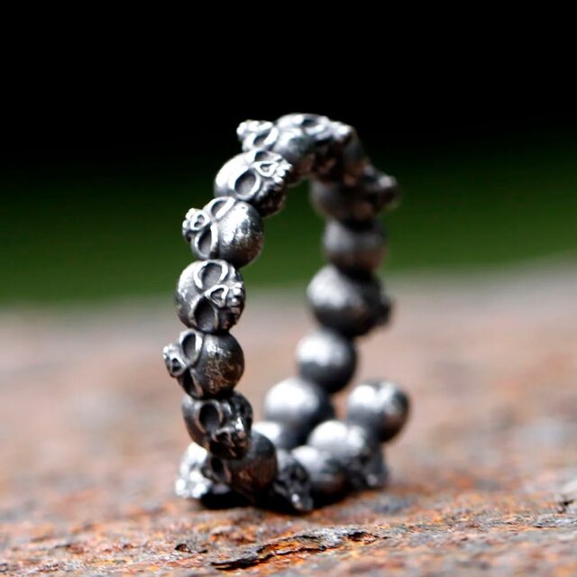 • Features exquisitely sculpted skulls intricately linked together.