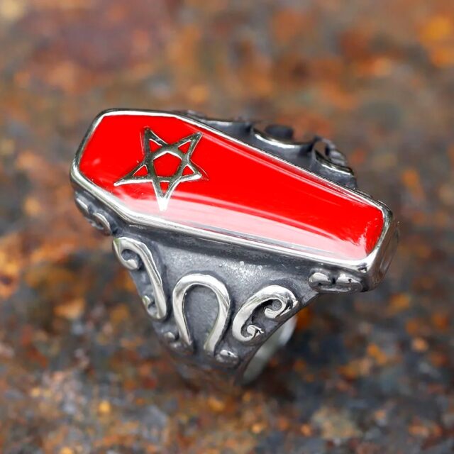 Sculpt Rings™ Gothic Coffin Ring – Red Pentagram Stainless Steel Band