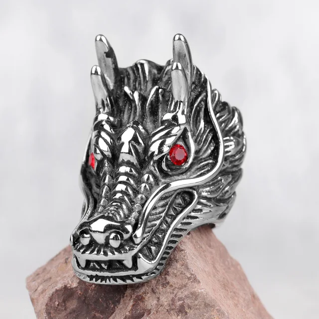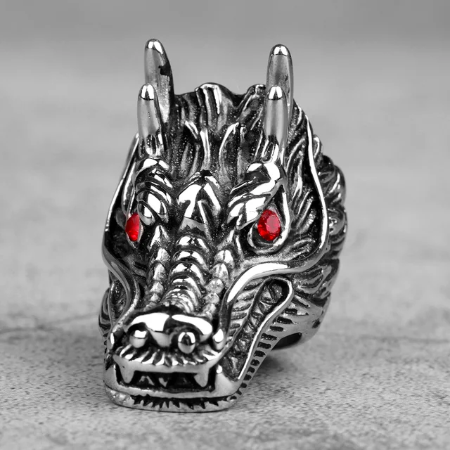 • Features a meticulously sculpted dragon head design with striking, vibrant red gemstone eyes.