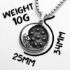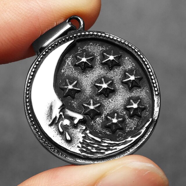 Elegant round pendant with moon and stars design in stainless steel. A symbolic accessory perfect for hip-hop, gothic, or spiritual styles. Pendant only – chain not included.