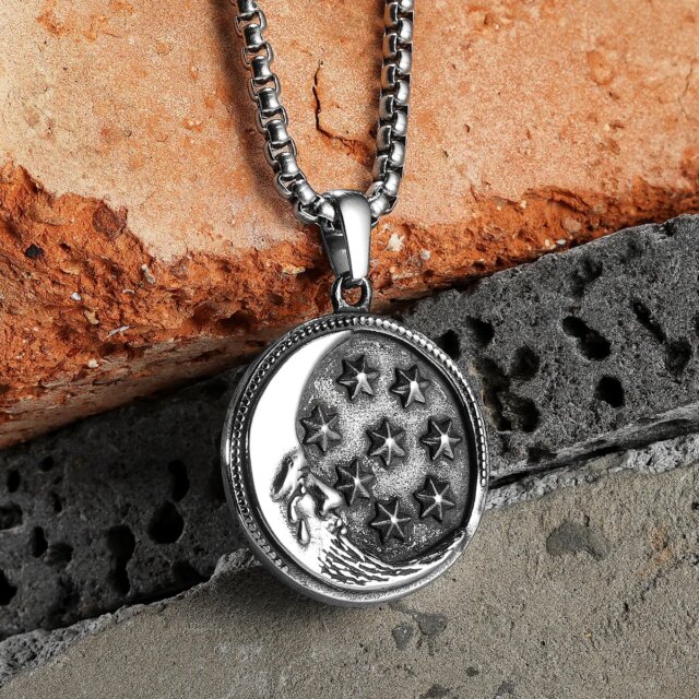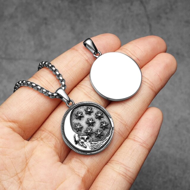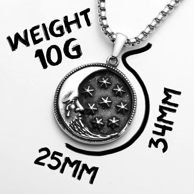 Embrace celestial vibes with this stunning round pendant featuring a moon, stars, and flowing detail. Crafted from high-quality stainless steel, it blends mystical charm with urban fashion. A unisex piece perfect for spiritual styles, hip-hop outfits, or meaningful gifts.