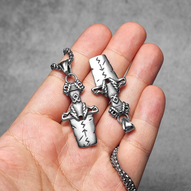 Unique stainless steel pendant shaped like a broken sword with rune engravings. 52mm tall, 10g lightweight.