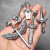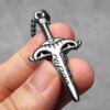 Stylized horned sword pendant in stainless steel. Lightweight at 11g, 60mm tall, with fantasy-inspired details.