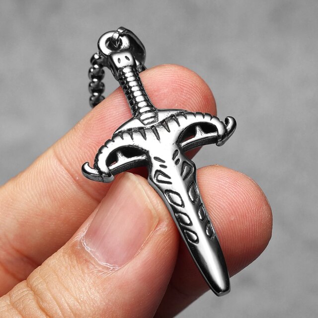 This horned sword pendant blends ancient weapon design with fantasy flair. Its curved guard and sleek blade are forged in stainless steel, making it the perfect accessory for warriors of myth, metalheads, or collectors of unique blades.