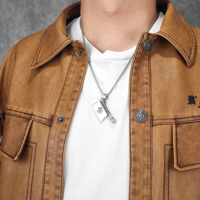 Slice through convention with this stainless steel kitchen cleaver pendant. Featuring a bold handle wrap and engraved Kanji character, this pendant blends culinary symbolism with streetwear aesthetics.