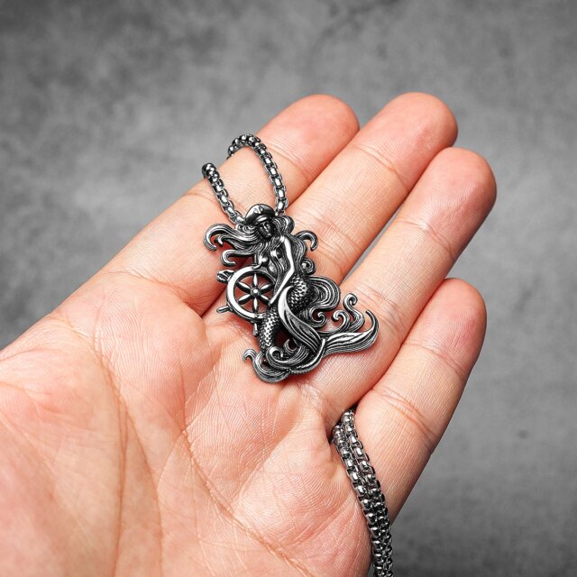 Stainless steel mermaid pendant with ship rudder – 13g of myth, motion, and maritime magic in one bold necklace.