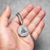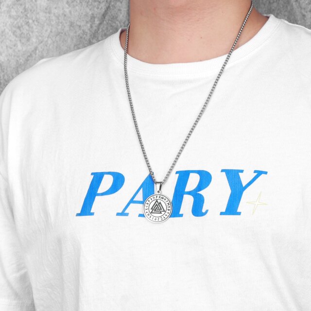 This stainless steel pendant features the Valknut — a symbol associated with the Norse god Odin, surrounded by ancient runes. It’s a bold tribute to strength, death, and rebirth in Viking mythology.