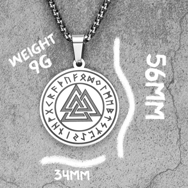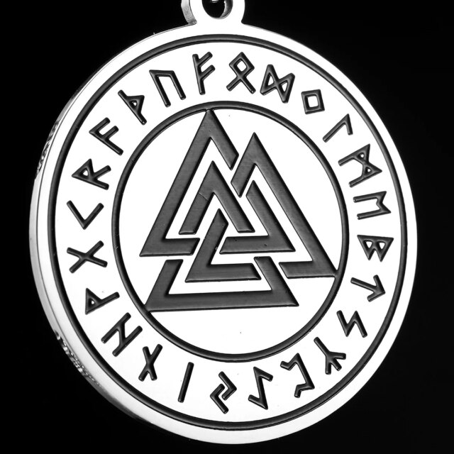 Valknut triangle pendant with runic circle in stainless steel. Lightweight and symbolic, this Norse amulet honors Odin and strength in battle.