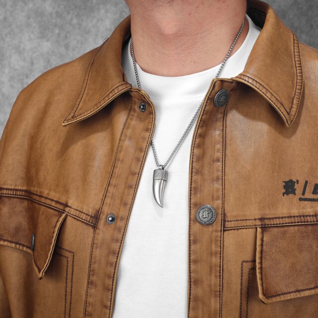 This powerful pendant features a curved ox horn design with a detailed textured cap, crafted entirely from high-grade stainless steel. With its strong tribal energy and substantial weight, it’s the perfect piece for those who want to project raw strength and primal spirit.