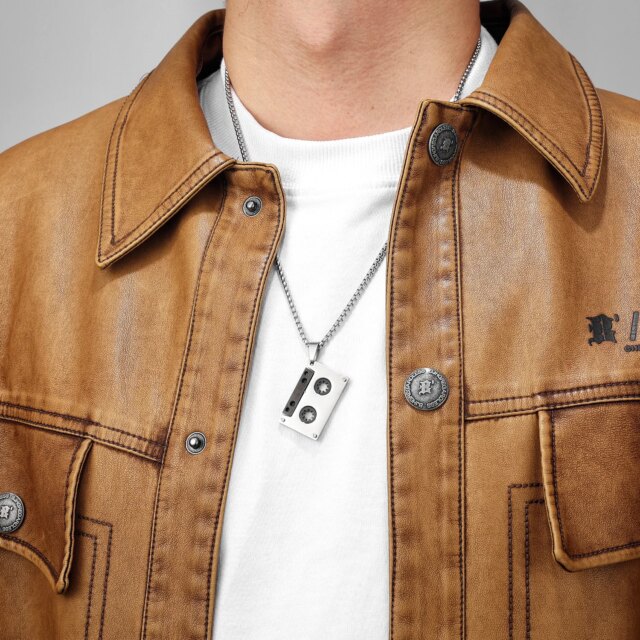 Celebrate your love for music with this vintage-inspired cassette tape pendant necklace – a stylish throwback in bold stainless steel.