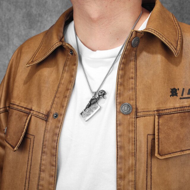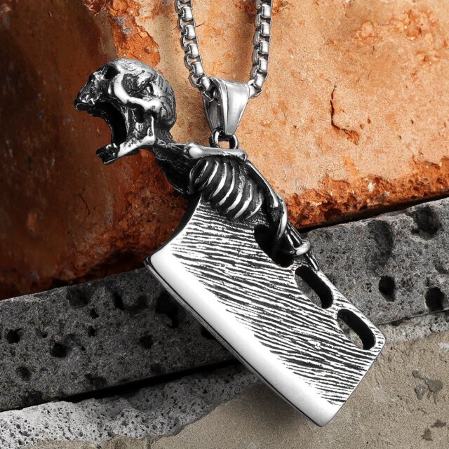 This statement pendant fuses darkness and craftsmanship into one brutal design. A realistic skeletal figure clings to a textured cleaver blade, forged from solid stainless steel for maximum impact.