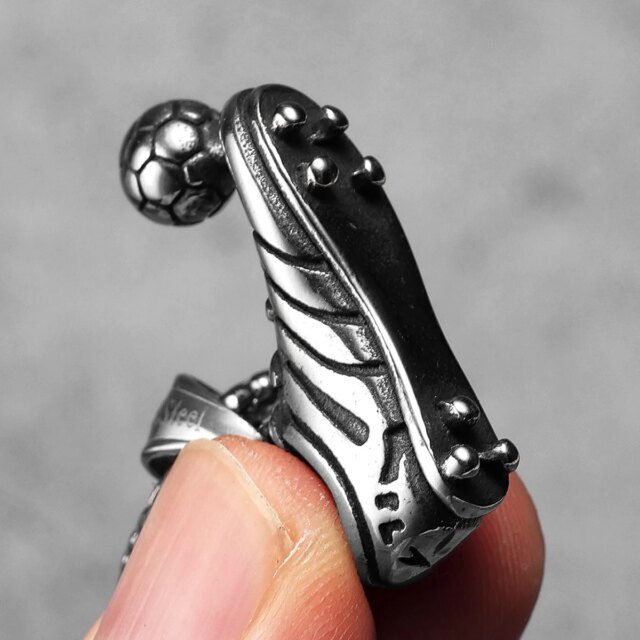 Score style points with this soccer-themed pendant featuring a detailed cleat and ball design. Made from stainless steel and perfect for football lovers.