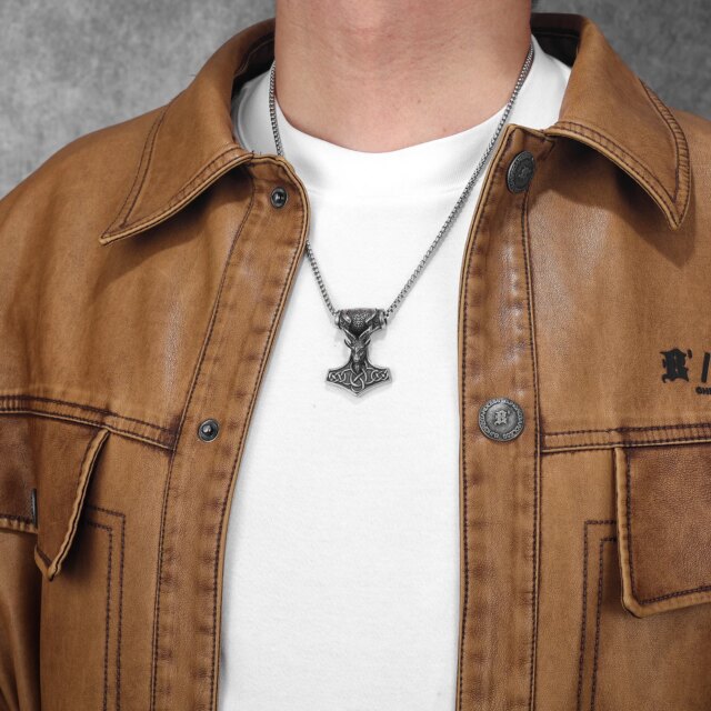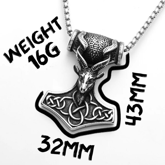 Inspired by Norse legend, this Thor’s Hammer pendant features Tanngrisnir — one of Thor’s magical goats — sculpted above a knotwork-engraved Mjölnir. Made from 316L stainless steel, it’s a bold, symbolic piece for Viking mythology lovers.