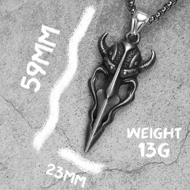 This striking pendant features a stylized Viking helmet with crow-beak elements and devilish horns — a fierce symbol of ancient Norse battle spirit. Crafted in rugged stainless steel, it’s built to last and designed to impress.