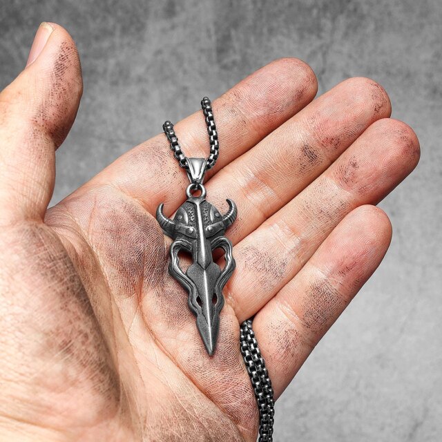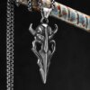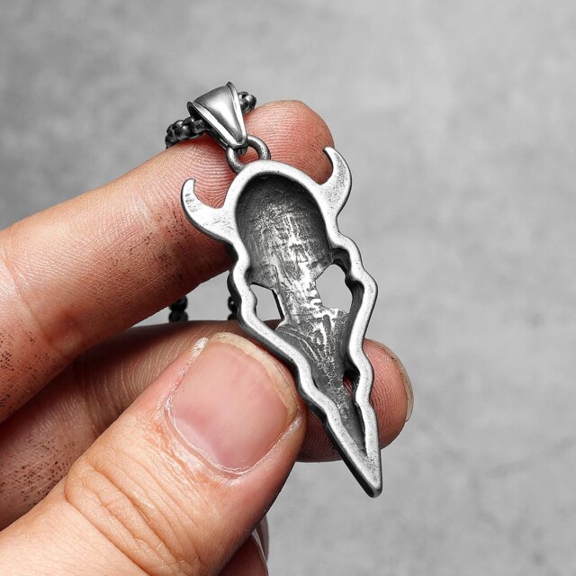 Horned Viking helmet pendant with crow-beak shape. Stainless steel build with intricate warrior-inspired design — perfect for Norse mythology lovers and metal fans.