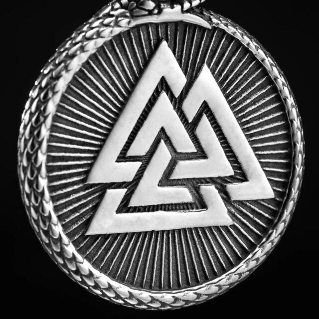• Design: Valknut triangle with encircling serpent